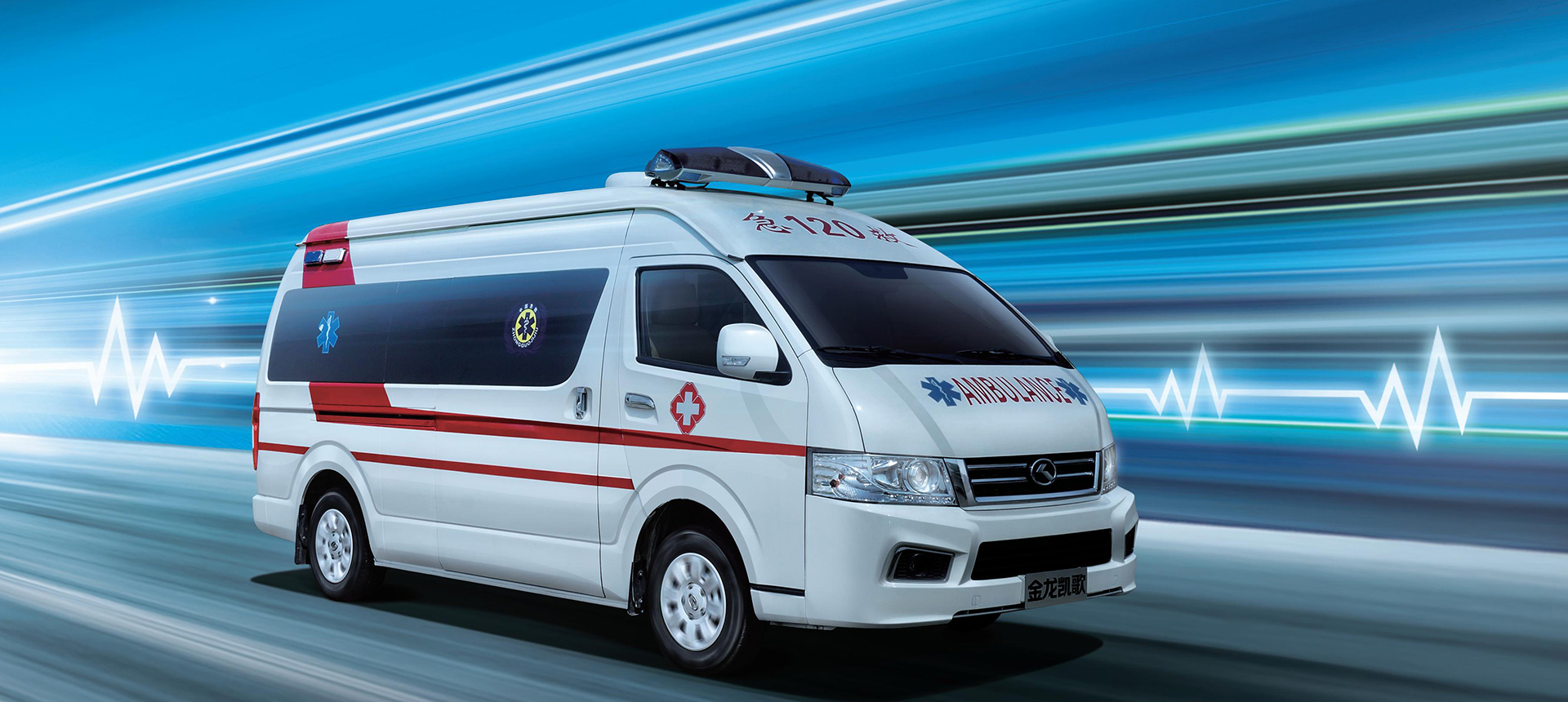 金龍凱歌監(jiān)護型救護車車頂LED藍色半圓弧形長排警燈、尾部爆閃警燈和場外照明燈