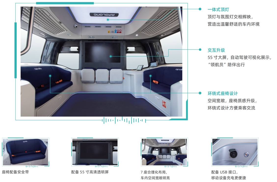 智能座艙提供豐富的人車交互體驗(yàn),乘客可在任意站點(diǎn)乘坐阿波龍 II 自動(dòng)駕駛小巴, 通過(guò)高清屏幕、領(lǐng)航員語(yǔ)音交互,可實(shí)時(shí)了解周圍路況、車輛駕駛狀態(tài)和周邊吃喝玩 樂(lè)信息,提供沉浸式自動(dòng)駕駛體驗(yàn)和一站式服務(wù)體驗(yàn)。