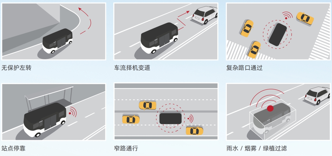 阿波龍 Ⅱ 融合了百度自動(dòng)駕駛系統(tǒng)和金龍深厚的造車經(jīng)驗(yàn),集成最新一代駕駛計(jì)算平臺(tái)及傳感器方案,搭載激光雷達(dá)系統(tǒng),視覺(jué)系統(tǒng),毫米波雷達(dá)系統(tǒng)等傳感器,實(shí)現(xiàn)感知區(qū)域的 360 度覆蓋以及傳感器、算法、計(jì)算硬件的安全冗余備份。探測(cè)范圍達(dá) 240m,定位精度達(dá)到厘米級(jí),完全不懼怕高樓、隧道等各種弱 GPS 環(huán)境;計(jì)算平臺(tái),從處理環(huán)境感知信息、預(yù)測(cè)障礙物行為到動(dòng)作規(guī)劃和執(zhí)行,整體響應(yīng)水平可達(dá)到毫秒級(jí);比上一代車型新增信號(hào)燈識(shí)別能力,具備開(kāi)放道路行駛的能力,具備 5G 無(wú)人駕駛能力,具備雨、雪、霧及高寒天氣行駛能力。